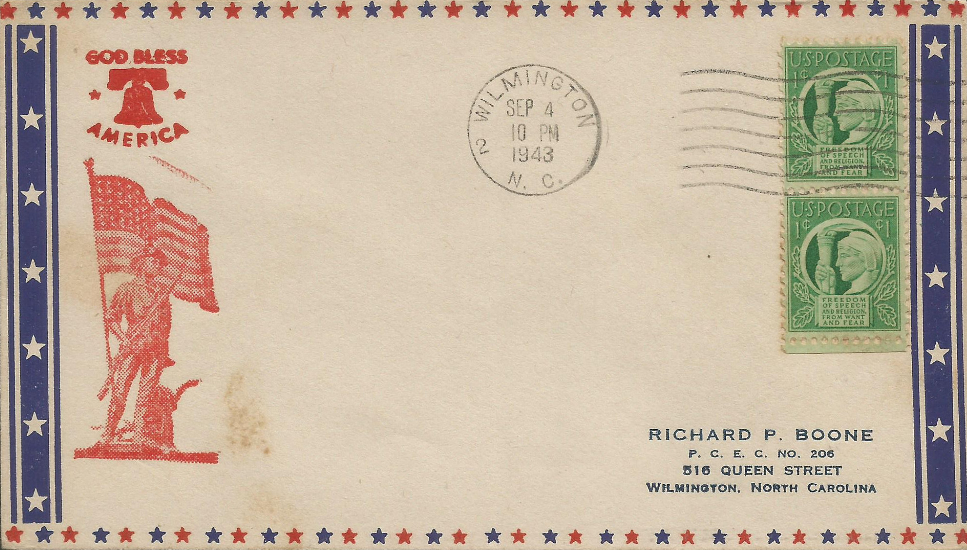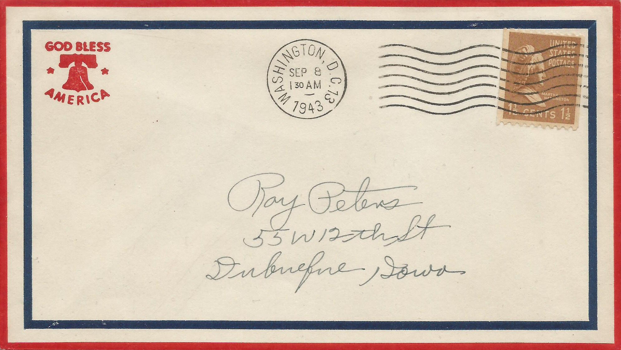 God bless America (bell at UL, Red & Blue lines frame envelope) |