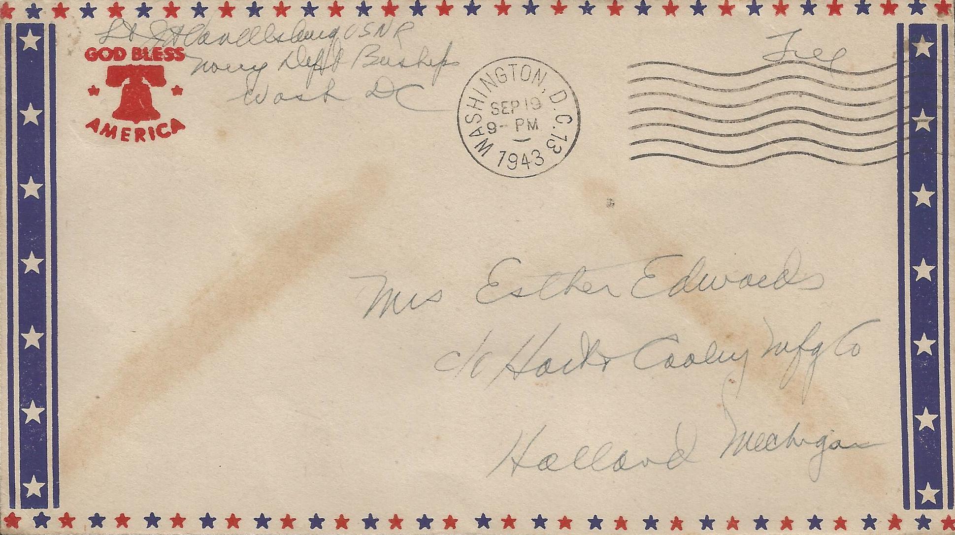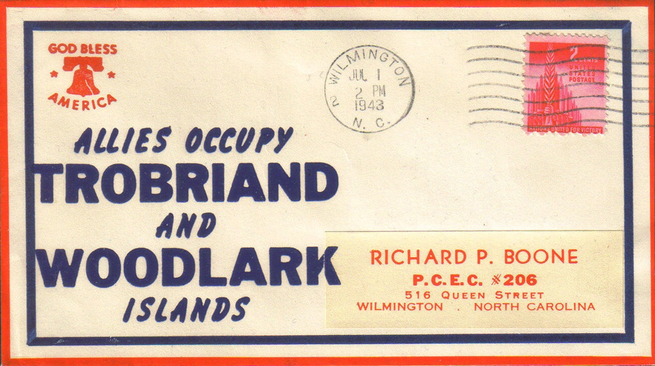 God bless America Allies occupy Trobriand and Woodlark islands etc (bell at UL, Red & Blue lines frame envelope) (thermographed) |