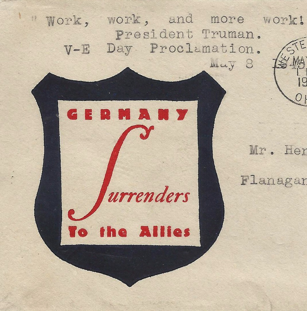 Germany surrenders to the Allies (text in shield) |